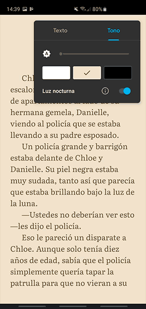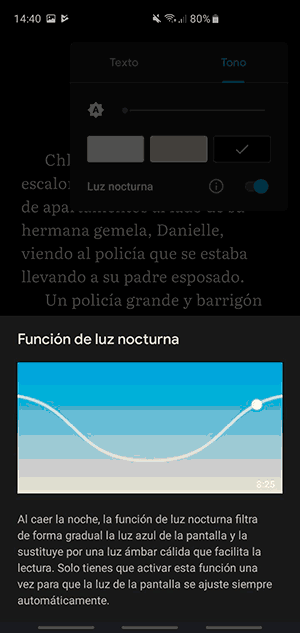 Pensando en nuestro descanso visual, Google decidido incorporar una nueva función llamada modo lectur dentro de Google Play Libros para poder filtra de forma gradual la luz que emite la pantalla. De esta forma paseremos de una luz azul al principio del día por una luz cálida más cómoda cuando tenemos poca luz o es de noche.