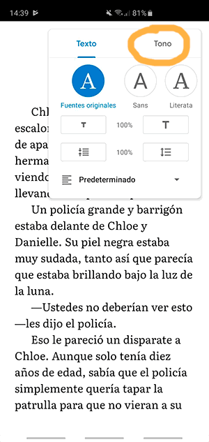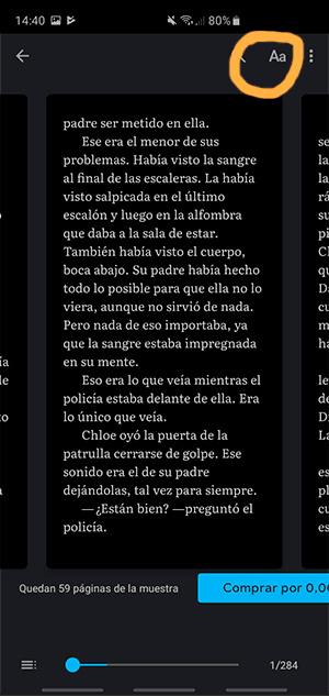 - Lo primero que tienes que hacer es abrir la aplicación de Play Libros. Abre el libro que quieras y pulsa sobre el icono de Aa que verás en la parte superior derecha.