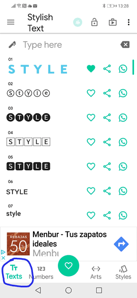 Una vez que la tienes descargada, lo que tienes que hacer es entrar dentro de la app. Verás que hay una cantidad bastante grande de tipos de letra asi como de números y estilos. Esto puedes verlo en la parte inferior.