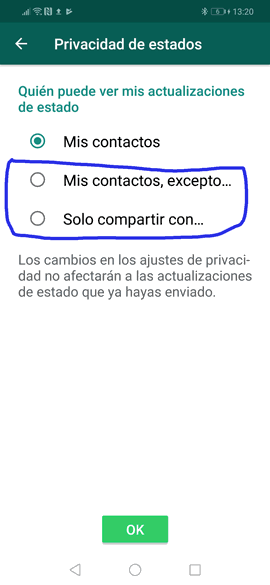 Debes saber que además de dicha alternativa, vas a poder observar una opción que dice “Solo compartir con”, la cual te permite seleccionar solo las personas que pueden ver tus estados, aunque este proceso es un poco más longevo.