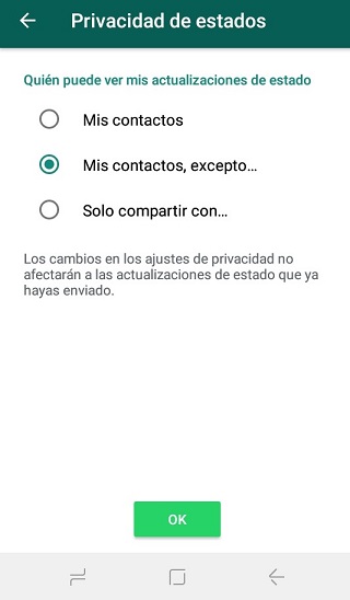 Paso 4: ahora veras que se presentan varias opciones de configuración para el estado, presiona sobre “Mis contactos, excepto…”
