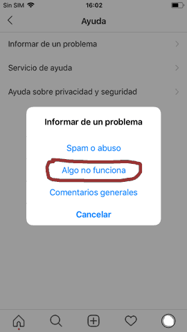 Para ello tienes que ir, dentro de la app y en el apartado de configuración selecciona "Ayuda". Desde aquí ve a "Informar de un problema" y en la ventana emergente selecciona "algo no funciona"
