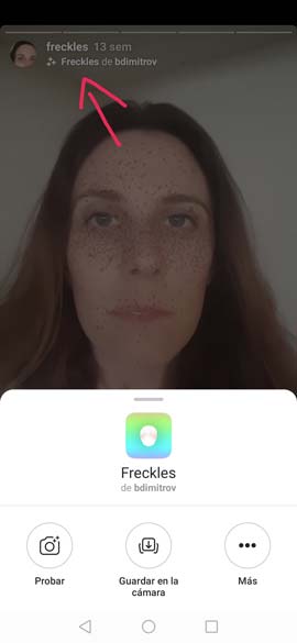 Cuando hayas hecho esto, vas a ver que ahora cuando entras a las historias de Instagram, lo vas a poder encontrar en la parte inferior. Basta con enfoques una cara o pongas la cámara selfie para poner la tuya y verás cómo aparecen estas pecas en el rostro.