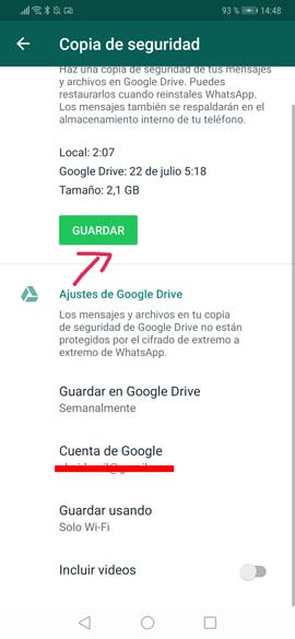 Automáticamente todos los mensajes, contenido multimedia y contactos se almacenan mediante tu cuenta de google en la nube virtual o Google Drive.