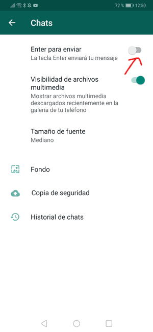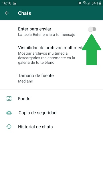 Paso 4: Luego observaras una opción que lleva por nombre “Enter para enviar” la cual posee un pequeño swich a su lado, debes desplazar este hacia la izquierda para desactivar el aparatado antes mencionado.