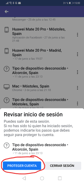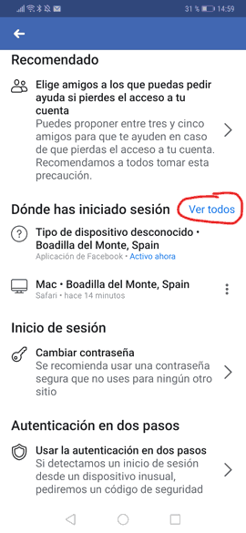 Vas a ver un listado con todos los inicios de sesi贸n que has realizado en Facebook. En el caso de que alguno de ellos no hayas sido tu, tienes que seleccionarlo .