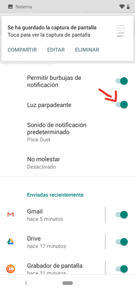 Ahora debes activar la pestaña de Luz parpadeante, para que quede activo. En el caso de que lo que quieras sea quitarla, tienes que desplazar esta pestaña hacia el lado izquierdo.