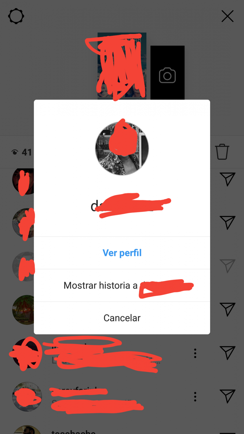 Cuando pulsas en los tres puntitos sobre el perfil que aparece en gris, me salen tres opciones: ver perfil, mostrar historia a, o cancelar.