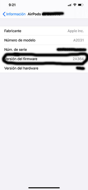 Aquí dentro puedes ver la información sobre el Firmware de los AirPods.