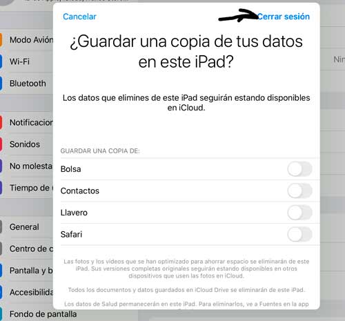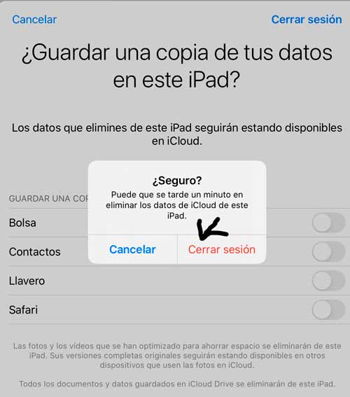 5- Lo siguiente que te aparece es que confirmes que se eliminarán los datos del iPad pero no de iCloud. Puedes guardar una copia de cosas como los Contactos o Safari. Pulsa en Cerrar sesión.