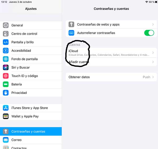 2- Ahora tendrías que elegir a la izquierda el apartado de Contraseñas y cuentas. En la derecha selecciona iCloud.