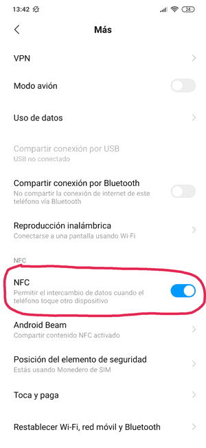 Ahora vas a ver que aparece un apartado que pone NFC, el cual debes asegurarte de que está activo para que puedas utilizar esto.