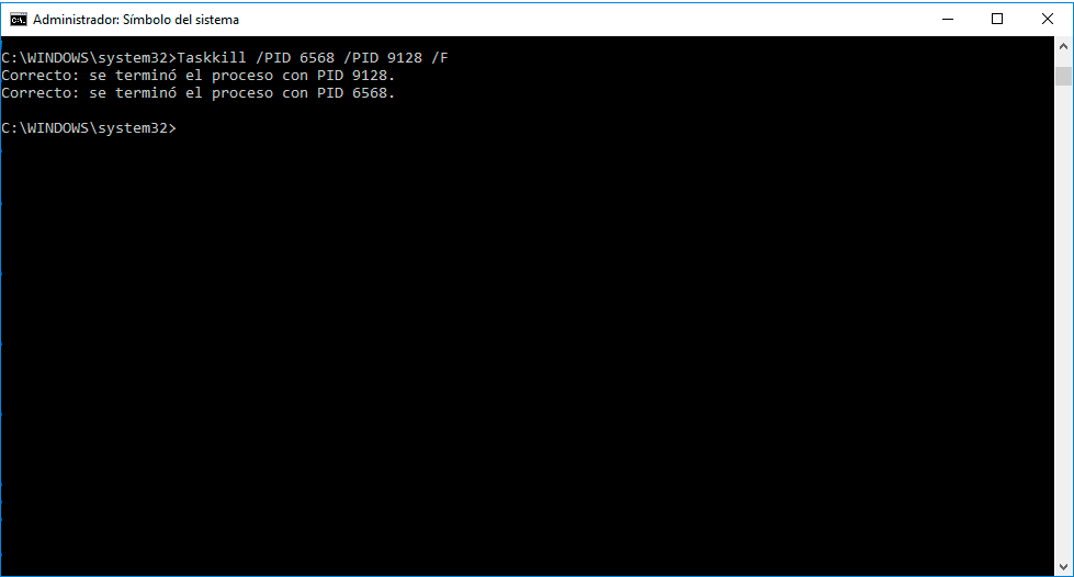 taskkill /PID ID_Proceso1 /PID IDProceso2 /F Taskkill / PID 9128 /PID 6568 / F