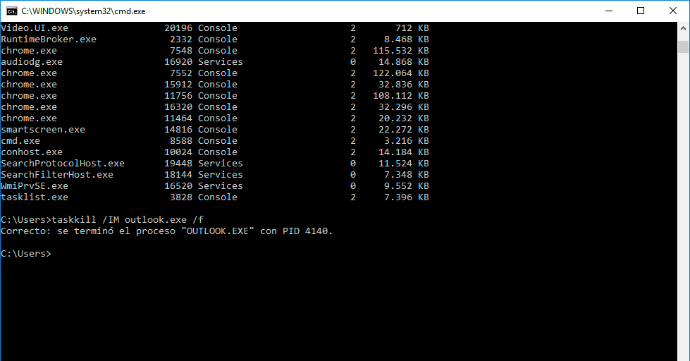 Taskkill /IM proceso /F Taskkill /IM outlook.exe /F