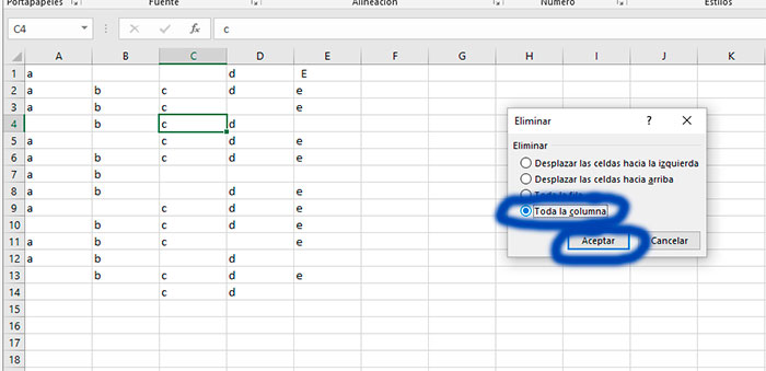 - Si deseas borrar la columna, el procedimiento es el mismo, pero en el momento en que aparece la ventana emergente tildas el apartado “Toda la columna” presionando luego en “Aceptar” de esta manera eliminaras la columna.