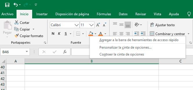- A continuación presiona con el botón derecho del mouse la flecha que aparece al lado del icono representado por un bote de pintura, este se encuentra en la parte izquierda justo debajo del tipo de letra, y se desplegaran varias opciones escoge “Agregar a la barra de herramientas de acceso rápido”.