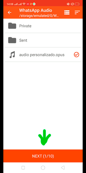 Posteriormente completas esta ruta la cual es WhatsApp, Media, WhatsApp Audio, justo en este paso es que puedes seleccionar el audio que deseas colocar, en este caso es la risa de tu pequeño primo, después presiona en “Sent” y a continuación pulsa en “Next” que puede visualizarse en la parte inferior de la pantalla.