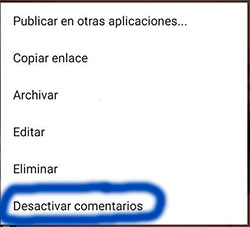 Esta opción se encuentra dentro de la publicación, pulsando el icono de 3 puntos y pulsando la opción “Desactivar comentarios”