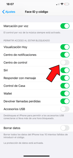 Ahora lo que debemos es desplazar hacia abajo hasta que veamos la zona que se llama "PERMITIR ACCESO AL ESTAR BLOQUEADO" y dentro de sus opciones podrás ver que hay una opción que se llama "Centro de control". Lo que debes es desactivar esta opción de Centro de control como ves en la imagen siguiente.
