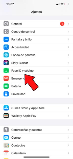 Entramos en "Ajustes" y posteriormente en la opción "Face ID y código" o "Touch ID y código" (Depende del modelo iPhone que tengas).