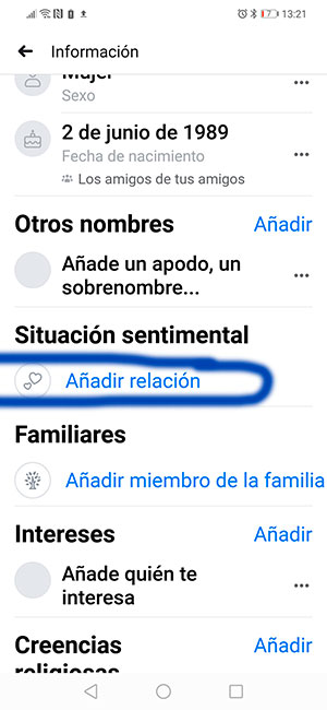 Aquí vas a ver el apartado de “Situación sentimiental” y es aquí donde puedes ver la que tienes establecida o cambiarla pulsando sobre la opción.