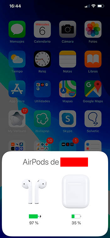 - Verás que salta un aviso en tu iPhone (al abrir el estuche donde te dice cuanto % de batería tiene el airpod izquierdo, airpod derecho y batería que tiene el estuche de tus Airpods)