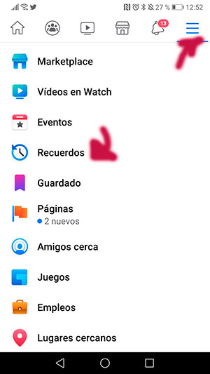 Lo primero que tienes que hacer es saber donde ir para ver tus recuerdos de días anteriores.Para ello tienes que pulsar en el icono de 3 líneas situado en la esquina superior derecha en tu perfil. Aquí, en las opciones que se va a desplegar pulsa en “Recuerdos”.