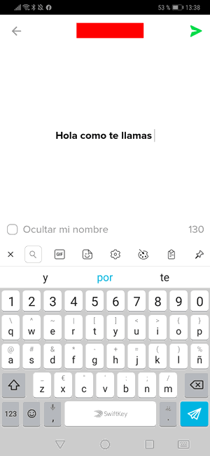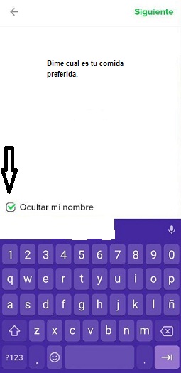 - Posteriormente veras que encima del teclado aparece la opción OCULTAR MI NOMBRE y a su lado izquierdo tiene un circulo, si deseas que tu pregunta llegue de manera anónima solo deberás pulsar sobre la opción y aparecerá una tilde verde en el círculo, si deseas que se vea muestre tu perfil no hagas nada y envía tu pregunta o mensaje.