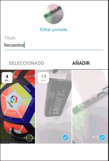 - Aquà verás para poner un tÃtulo. En la opción de “Añadir†puedes elegir más historias subidas que pueden ser fotos o vÃdeos y añadirlos esa historia principal destacada.