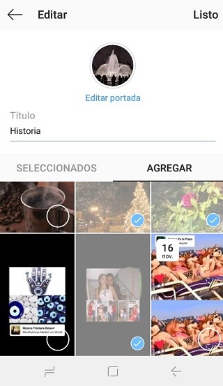 - “Agregar†pulsado esta opción podrás seleccionar entre todas las historias cual deseas adicionar en esta destacada, solo pulsas sobre ella y presionas en “Listoâ€