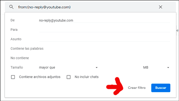- En la ventana esta que se abre tienes que pulsar sobre “Crear filtro”