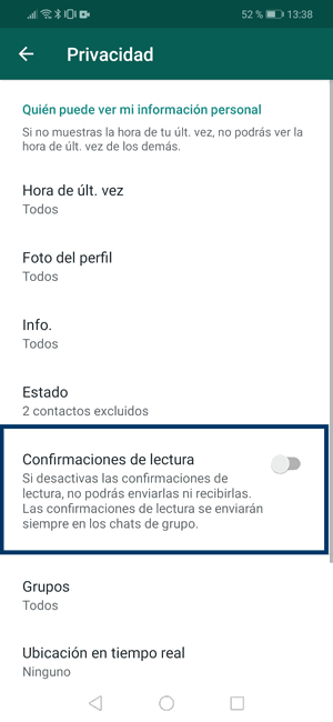 Si desactivas esto, la confirmación de lectura dejará de aparecer a los contactos con los que hables, exceptuando en las conversaciones de grupo. Resumiendo esto, en algunas conversaciones puedes ver el check azul y en otras no, ya que depende de si la persona con la que hablas tiene o no activada la conversación de lectura.
