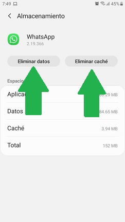 En este lugar habrán dos botones, los cuales son “Eliminar caché” y “Eliminar datos”, ambos deben ser presionados por ti para que se pueda solventar la falla del visto en tu cuenta.