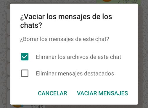 - Se abrirá una ventana con varias opciones, solo debes escoger la que más te convenga, bien sea “Eliminar los archivos de este chat” o “Vaciar”.