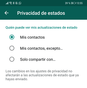 Mis contactos: Si seleccionas esta opción, solo verán el estado que has publicado aquellas personas que tienes registradas en tu agenda.