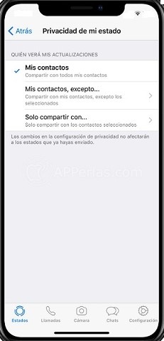Solo compartir con: Aquí podrás seleccionar aquellos contactos con los que quieres compartir tu estados, excluyendo a todos los demás de la lista.