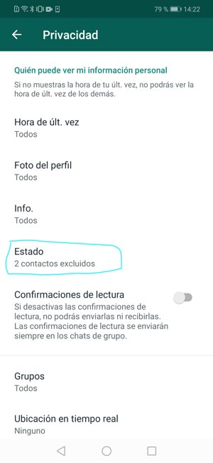 Si pulsas sobre esta opción. verás que aparece la privacidad de los estados. Tienes que seleccionar la opción de "Mis contactos excepto..." Desde aquí vas ver todos los contactos que tienes ocultos y desde aquí vas a poder colver a activarlo para que pueda ver tus historias.