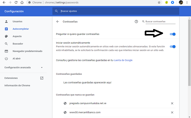 - A continuación se abrirá una ventanadonde aparece la opción “preguntar si quiero guardar contraseñas” esta tiene a su lado un botón que debes deslizar hacia la derecha para activarlo y a la izquierda para desactivarlo.