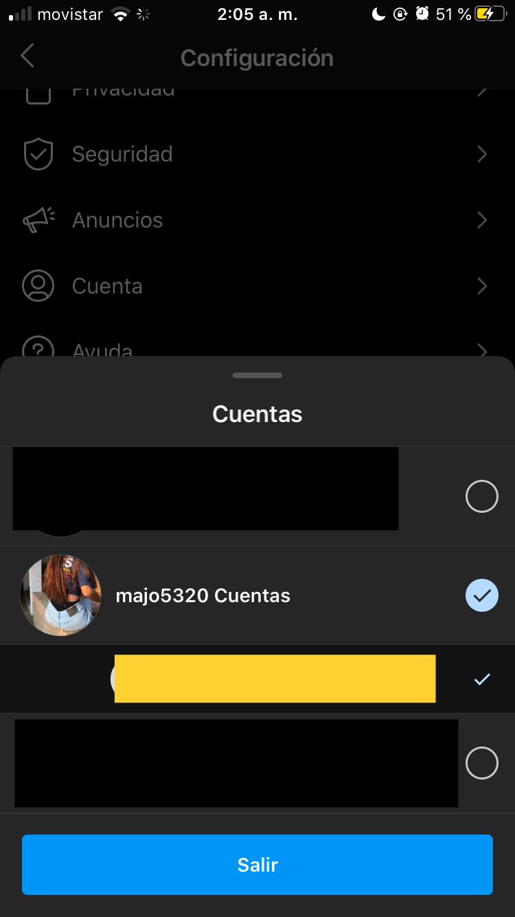 Les explico, mi cuenta principal es esa del nombre que se ve en la foto y la que está tachada en amarillo es la cuenta que vincule por accidente al crearla, Instagram me dio l opción de cómo vincularla por así decirlo y así al meter una clave en una se abrieran ambas, ahora quiero saber cómo deshago eso??? Ayuda por favor