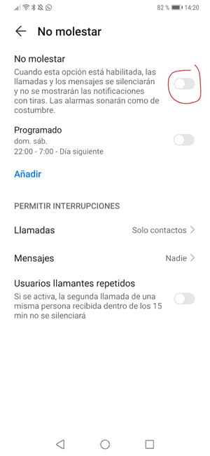 Sigue esta ruta en Huawei: AJUSTES-SONIDOS-NO MOLESTAR