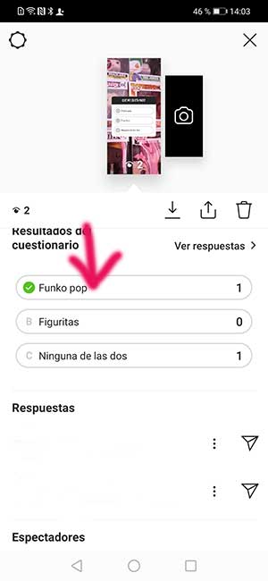 Ahora, verás que en la parte superior aparece cuantas personas han contestado cada cosa. Debajo puedes ver quien ha visto la historia y quien ha respondido la historia. Si quieres ver qué personas han respondido esa opción, pulsa sobre esa opción en concreto.