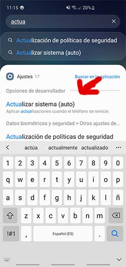Es posible que se haya movido de sitio la opción de actualización y por eso no la encuentres. Para comprobarlo vete a la pantalla del Galaxy y desplaza hacia abajo. Cuando se abra el buscador busca por palabras como “actualización” o “actualizar”, debería salirte “Actualizar sistema”.