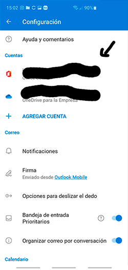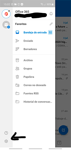 - Abre Outlook. Pulsa en las 3 rayas horizontales y después pulsa en el icono del engranaje inferior.