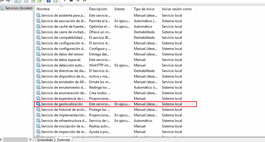 Investigué y suele pasar porque el servicio de geolocalización esta deshabilitado , así que fui a services.msc