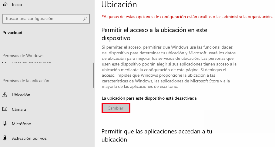 No puedo habilitar la opción de "Permitir el acceso a la ubicación en este dispositivo" .