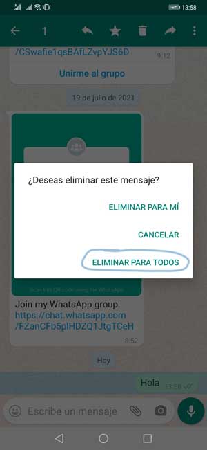 Verás que aparece una ventana emergente en la que debes pulsar sobre "Eliminar para todos" y de este modo el mensaje no va a aparecer a la otra persona y no sabrá que ponía en el caso e que no lo haya visto.