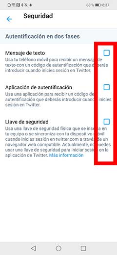 Si todavía tienes la cuenta de Twitter activa en el primer terminal la solución está al alcance de tu mano, ya que será tan sencilla como desactivar la verificación en dos pasos en esta primera cuenta y de este modo ya no necesitarás el código de verificación en este segundo terminal.