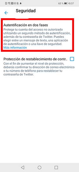 Tendrás que pulsar en la opción de Autenticación en dos fases para continuar.