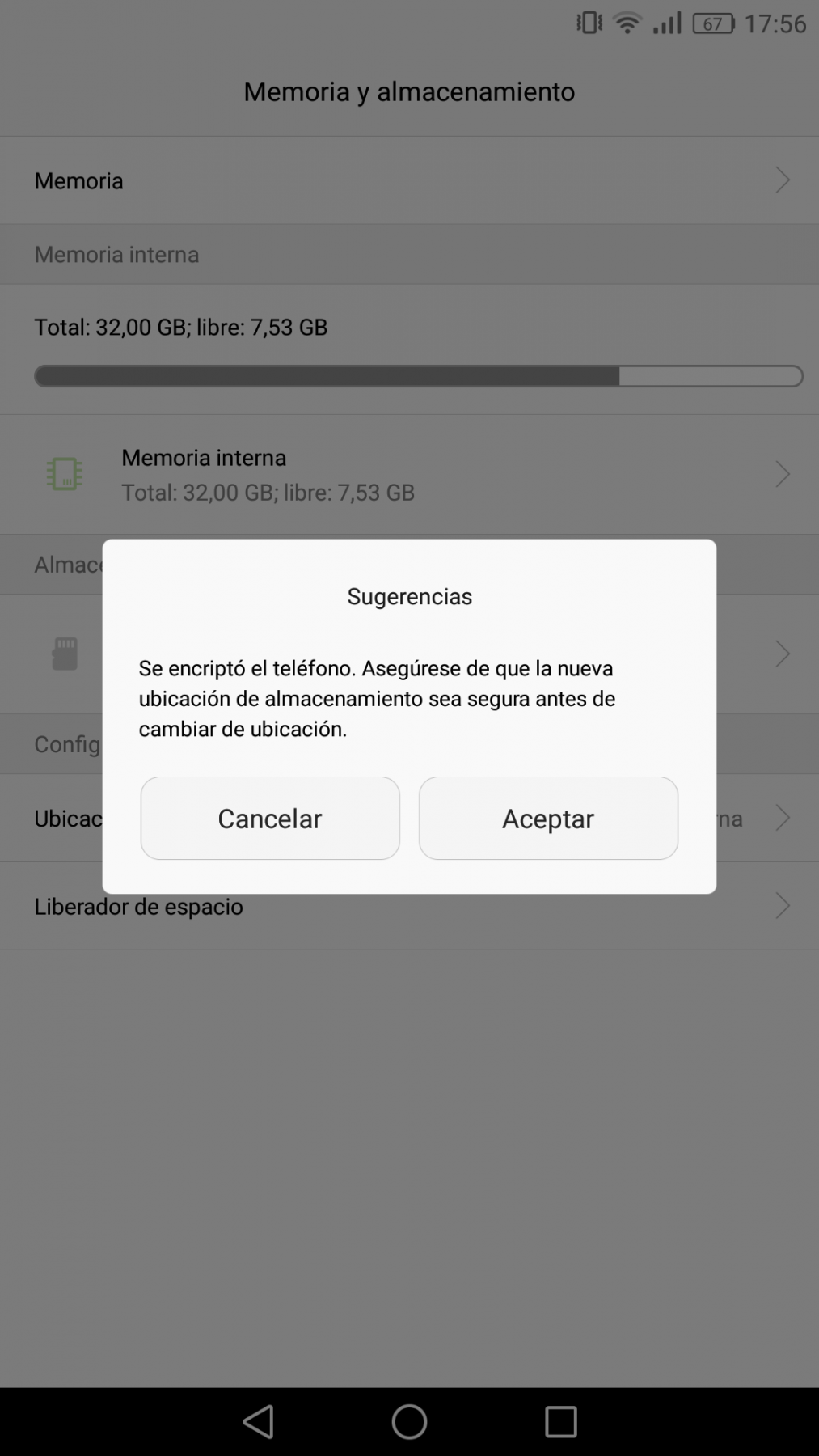 Se encriptó el telefono. Asegurese de que la nueva ubicación de almacenamiento sea segura antes de cambiar de ubicacion.