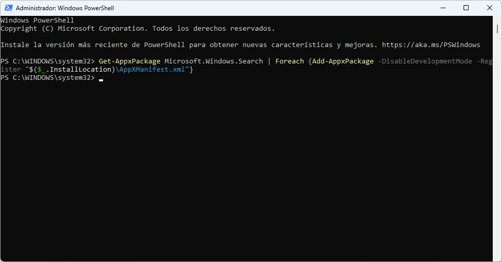 Get-AppxPackage Microsoft.Windows.Search | Foreach {Add-AppxPackage -DisableDevelopmentMode -Register "$($_.InstallLocation)\AppXManifest.xml"}